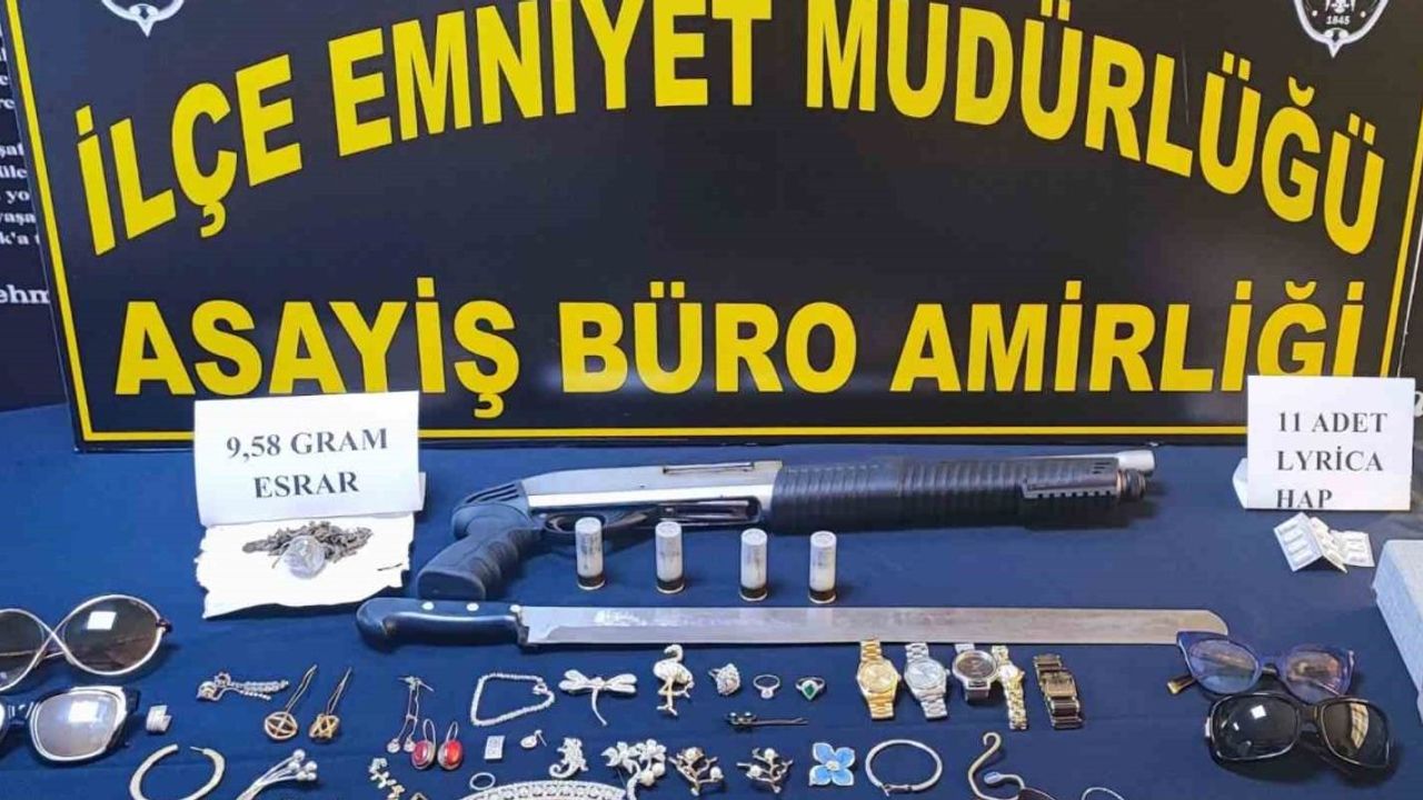 Şahsın ikametinde ve aracında yapılan aramada; 1 adet pompalı tüfek, 4 adet kartuş, 1 adet sallama bıçağı, 11 adet uyuşturucu hap, 2 adet saat, 2 adet tek taş pırlanta yüzük, 1 adet pırlanta bileklik, 4 adet taşları değerli gözlük, 4 adet taşları değerli broş, 6 adet değerli ziynet eşyasına el konulup, müşteki E.A.B.'nin çalınan eşyaları teslim edildi.