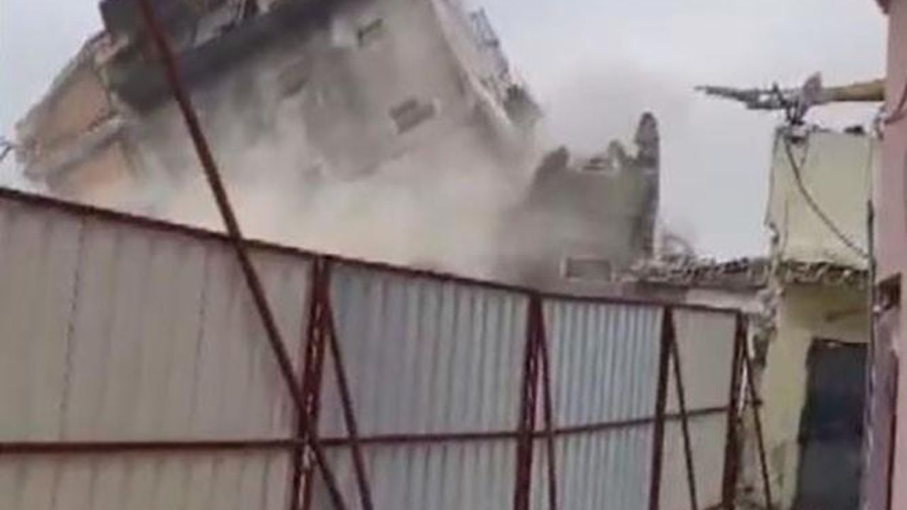 Hatay’ın Antakya ilçesinde bulunan 4 katlı hasarlı bina, iş makinasının darbesiyle yerle bir oldu.