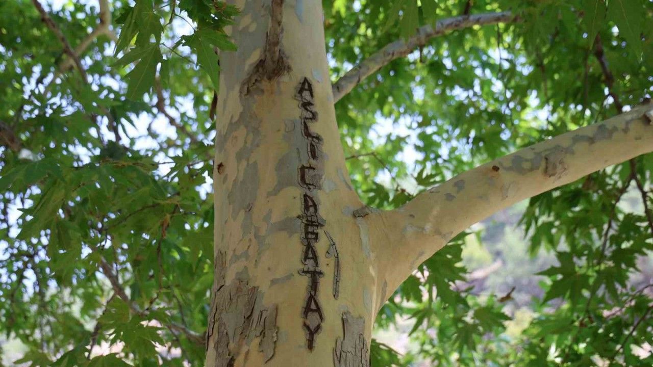 Adana’nın Kozan ilçesinde yaklaşık 45 yıllık olduğu değerlendirilen çınarın gövdesi ve dalları bıçakla kazınarak yazı tahtasına çevrildi. Vatandaşlar ise ağacı korumak için gövdesini çuvallarla sardı.