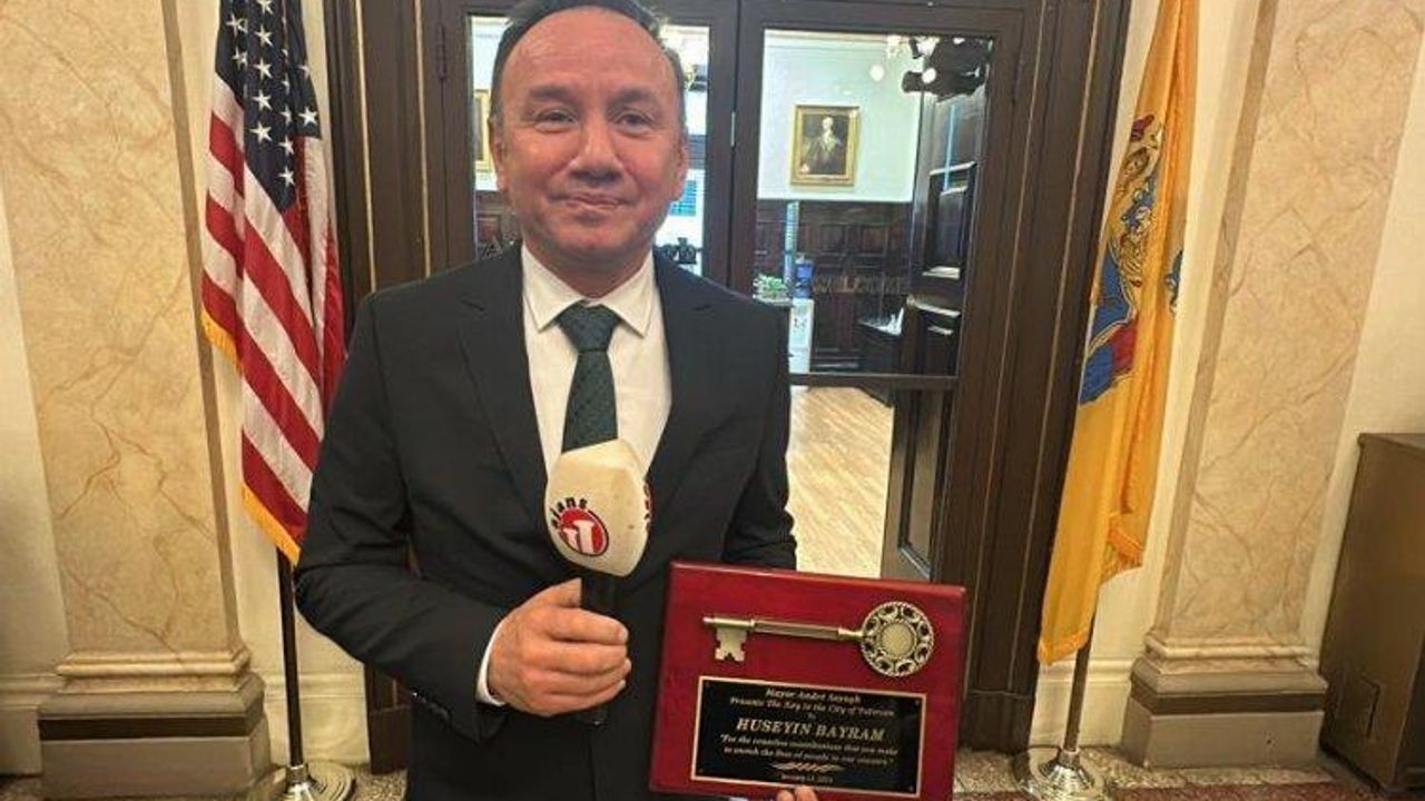 ABD'de bir şehrin anahtarını alan ilk Türk olan Bayram, anahtarı Paterson Belediye Başkanı Andre Sayegh’in elinden aldı.