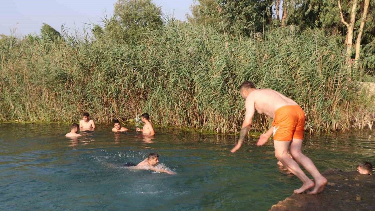 Adana’da Basra ve Afrika sıcaklarının etkisiyle termometreler rekor kırarken, Kozan’da gençler serinlemek göletlere akın etti.