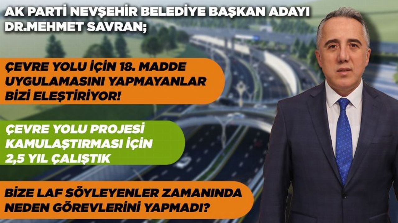 AK Parti Belediye Başkan Adayı Dr. Mehmet Savran, “Keşke Çevre Yolu Projesi için bugün bizi eleştirenler görev sürelerinde 18. Madde uygulamasını yapsalardı da biz bugün çevre yolunun inşaatını konuşuyor olacaktık.” dedi.