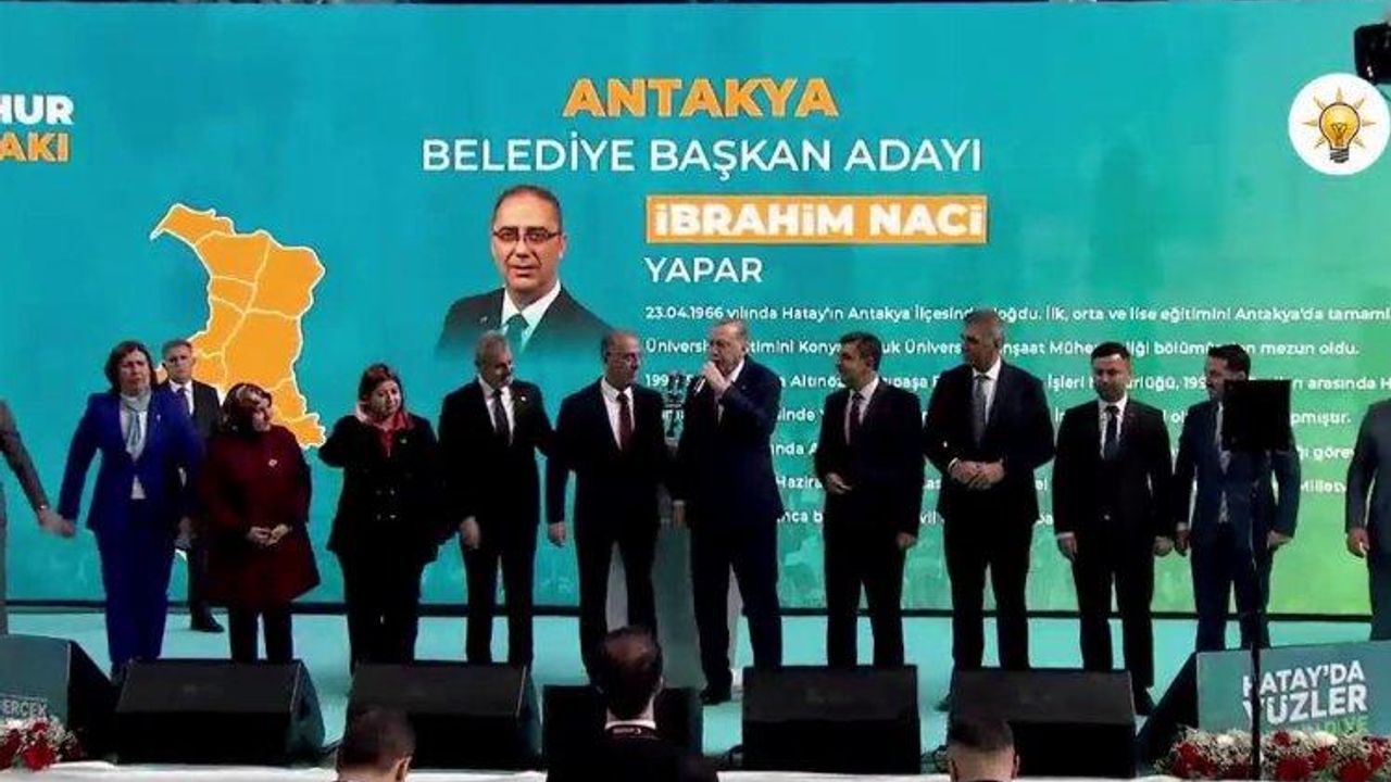 Cumhurbaşkanı Erdoğan Hatay'da, AK Parti'yi ve Cumhur İttifakı'nı temsil edecek ilçe belediye başkan adaylarını tanıttı.HATAY (İGFA) - Cumhurbaşkanı Erdoğan, Antakya Spor Salonu'nda düzenlenen AK Parti Hatay İlçe Belediye Başkan Adayları Tanıtım Toplantısı'na katıldı.