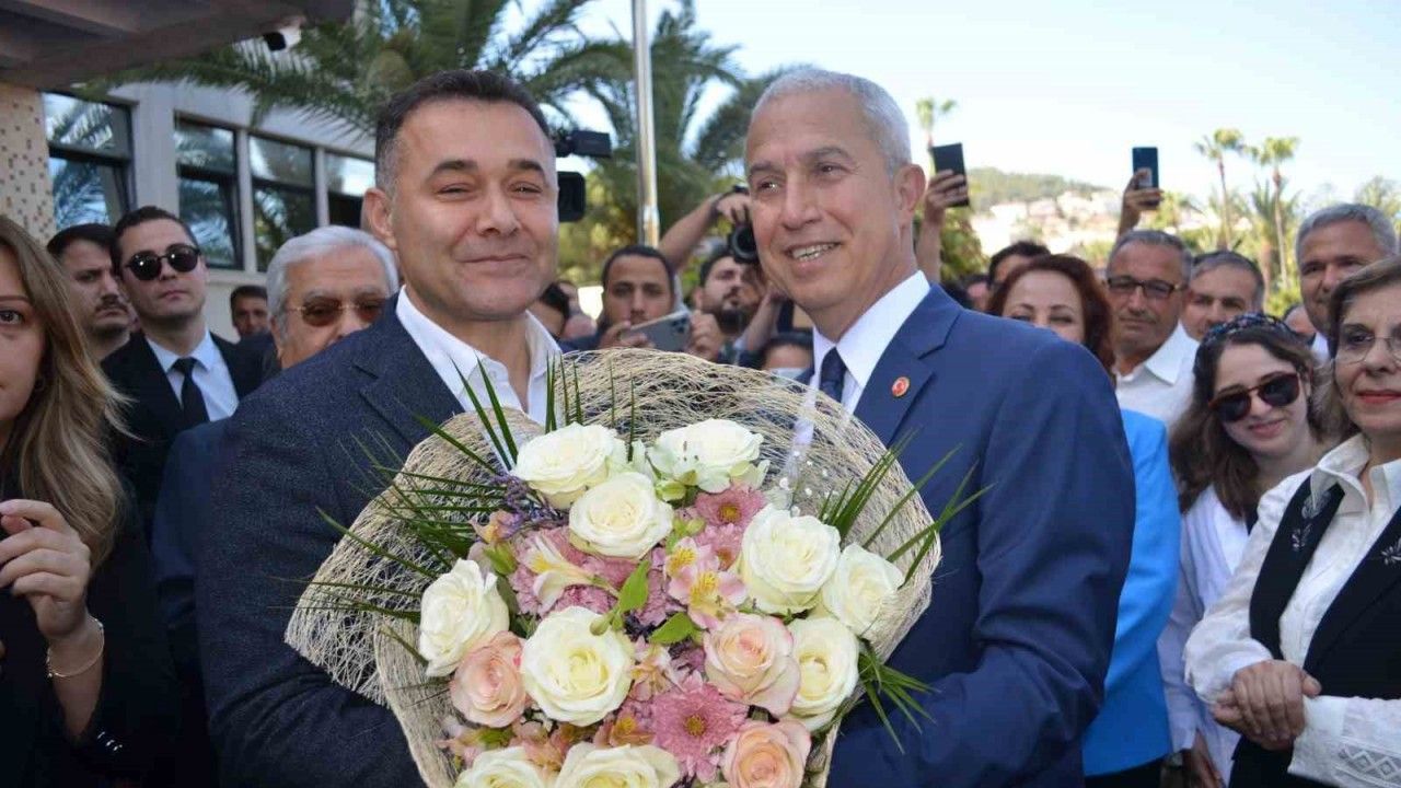Önceki dönem Alanya Belediye Başkanı Adem Murat Yücel, Başkan Osman Tarık Özçelik’i Belediye Binası giriş kapısının önünde karşılayarak çiçek ve hediye takdim etti.