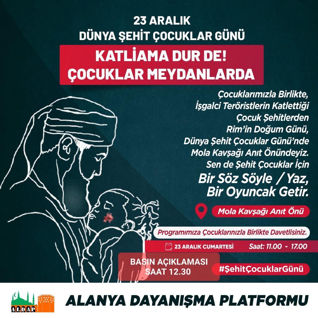Alanya'da katliama karşı ses vermek için bir araya gelen Alanya dayanışma platformu, 23 Aralık Dünya Şehit Çocuklar Günü'nde, Filistin başta olmak üzere dünyanın dört bir yanında işgal ve terör nedeniyle hayatını kaybeden çocuk şehitleri anmak için "Katliama Dur De, Çocuklar Meydanlarda" adlı bir etkinlik düzenliyor.