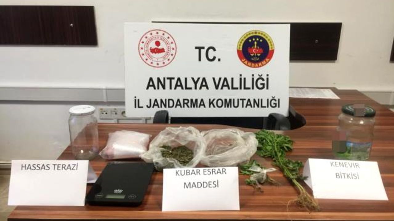Alanya Cumhuriyet Başsavcılığı koordinesinde Antalya İl Jandarma Komutanlığına bağlı Alanya İlçe Jandarma Komutanlığı ekiplerince Dinek Mahallesi'nde Ö.K. isimli şahsın evinde uyuşturucu madde imal ederek sattığı tespit edildi. Düzenlenen operasyonda 32 kök kenevir bitkisi, 800 gram kubar esrar maddesi ve 1 adet hassas terazi ele geçirildi. Gözaltına alınan şüpheli, işlemlerinin tamamlanmasına müteakip adli makamlara sevk edilecek