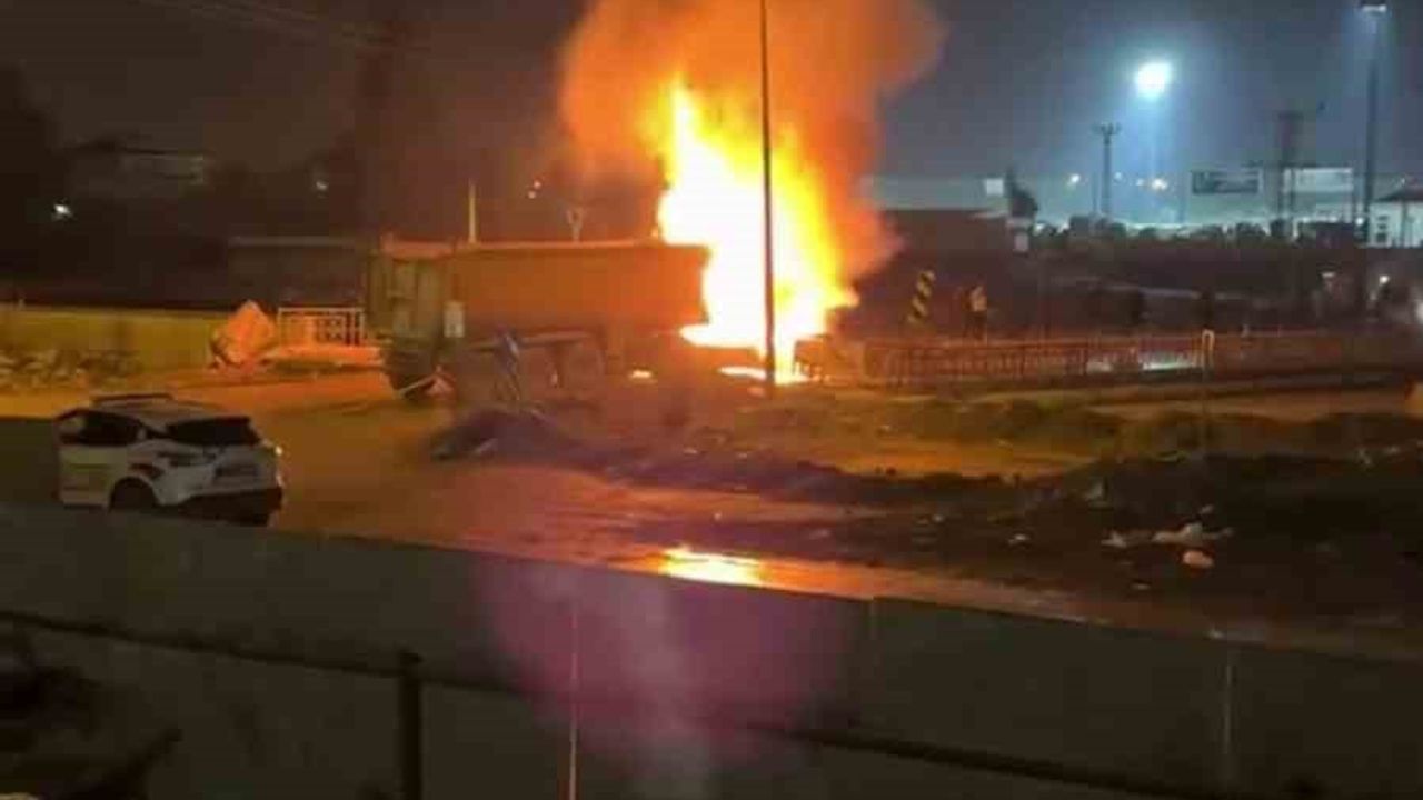Hatay’da seyir halindeyken alevlere teslim olan hafriyat kamyonunda yaşanan patlama kameraya yansıdı.