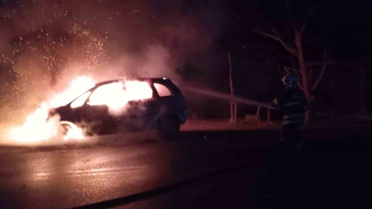 Hatay’da alevlere teslim olan otomobil yanarak kullanılmaz hale geldi.