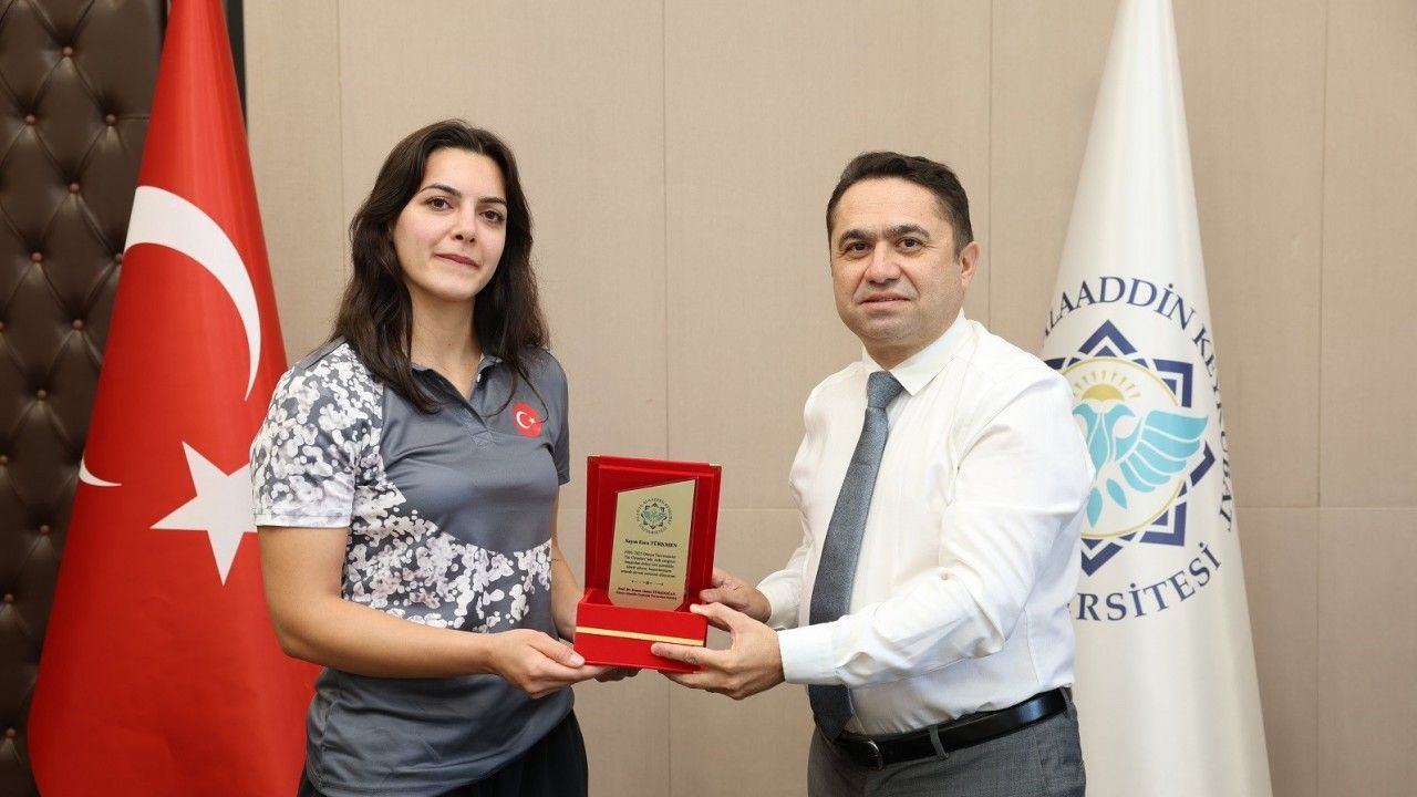 Alanya Alaaddin Keykubat Üniversitesi (ALKÜ) Rektörü Prof. Dr. Kenan Ahmet Türkdoğan, FISU 2025 Dünya Üniversiteler Yaz Oyunları’nda cirit atışında şampiyon olan ALKÜ Spor Bilimleri Fakültesi öğrencisi milli ciritçi Esra Türkmen’i tebrik ederek, plaket takdim etti.