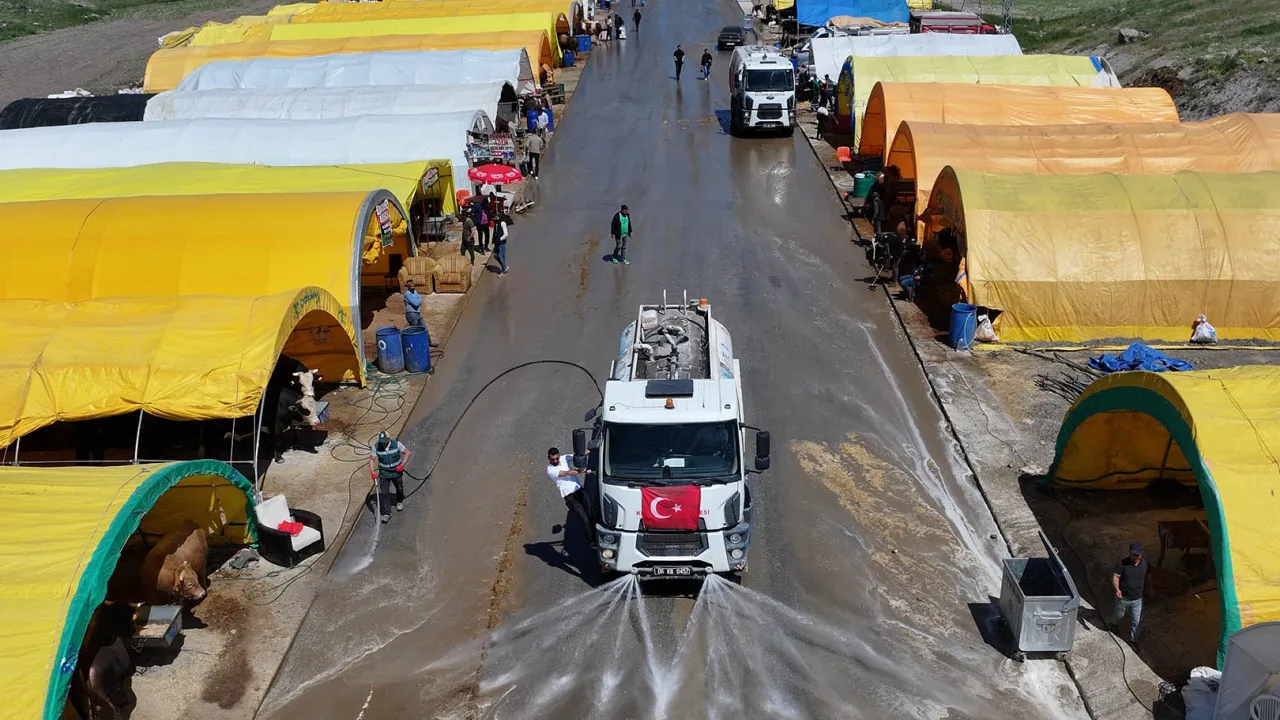Keçiören Belediyesi tarafından Bağlum Karşıyaka Mahallesi’ne kurulan kurban satış alanında hijyen ve güvenli alışveriş ortamı oluşturmak için temizlik ve ilaçlama ekipleri seferberlik ilan etti.ANKARA (İGFA) - Bağlum Karşıyaka Mahallesi’ndeki 186 çadırlık kurban satış alanında üreticilerin ve vatandaşların ihtiyaçlarını karşılamak üzere birçok hizmet noktası kuruldu. Keçiören'de günlük gerçekleştirilen çalışmalarda süpürge araçları, tankerler ve tazyikli suyla alan yıkanarak tertemiz hale getiriliyor.