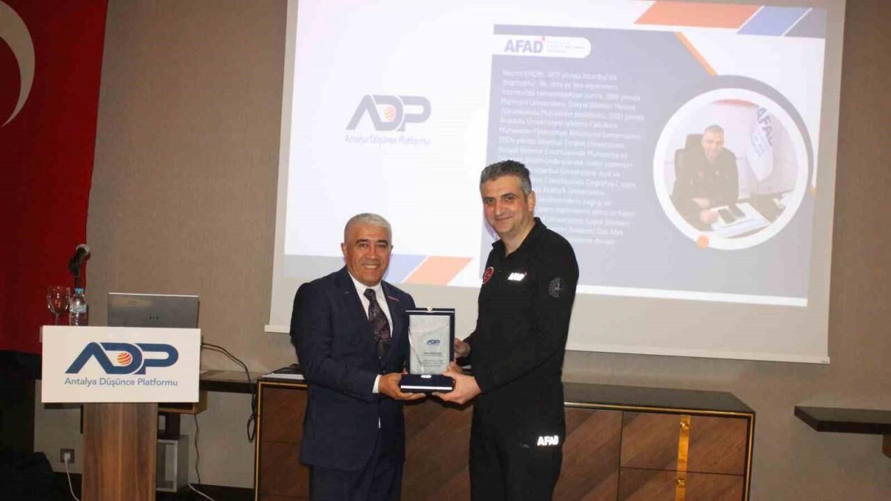 Antalya Düşünce Platformu’nun konuğu olan Afet ve Acil Durum Antalya İl Müdürü (AFAD) Necmi Erçin, Türkiye’nin deprem kuşağında olduğunu belirterek, "Böylesine büyük acılar bir daha yaşamamak için AFAD olarak çalışmalarına hız kesmeden devam ediyor, birçok proje ve eğitim programları ile kentimiz için çalışıyoruz. Öngörülemez bir afet durumunda organize şekilde hareket etmenin öneminin çok büyük" dedi.