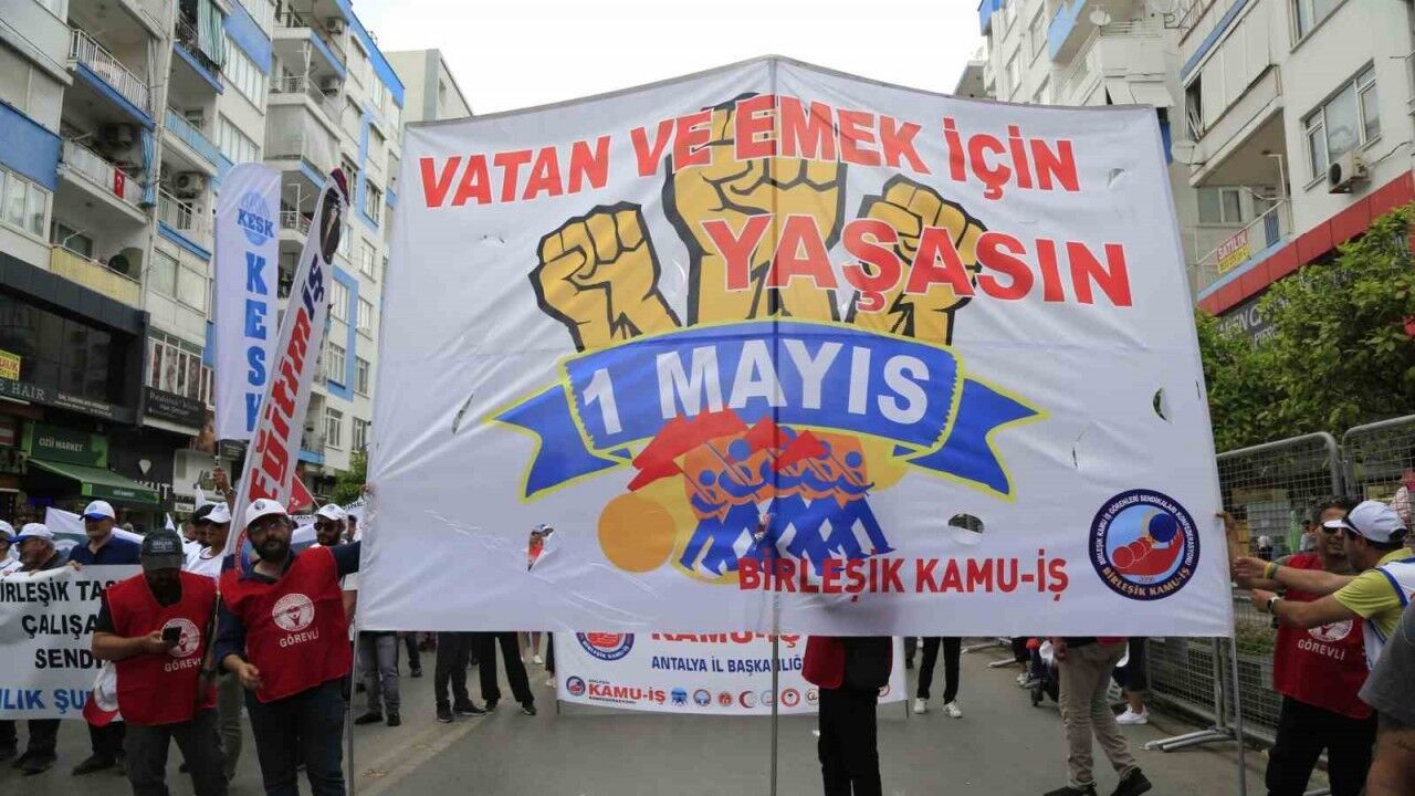 1 Mayıs Emek ve Dayanışma günü, Türkiye’nin dört bir yanında olduğu gibi Antalya’da da büyük bir coşku içinde kutlandı. Disk, Türk-İş Birleşik Kamu-İş, KESK, Antalya Tabip Odası ve TMMOB’un öncülüğünde düzenlenen korteje yaklaşık 5 bin kişi katıldı. Aydın Kanza Parkı’ndan başlayan 1 Mayıs korteji için sabahın erken saatlerinden itibaren yürüyüş güzergahı ve miting alanında geniş güvenlik önlemleri alındı. Alana giren vatandaşlar Antalya Emniyet Müdürlüğü’ne bağlı polis memurları tarafından tek tek aramadan geçirildi. Davul ve zurnalar eşliğinde Aydın Kanza Parkı’ndan yürüyüşe başlayan çeşitli siyasi parti, sendika ve STK’lara bağlı binlerce kişi yaklaşık 2 kilometrelik kortejin ardından sloganlar eşliğinde Cumhuriyet Meydanı’na geldi. Cadde üzerinde bulunan binaların balkonlarındaki vatandaşlar da ellerinde Türk bayrakları ile korteje katılanlara destek verdi. Kortej sırasında başlayan ve kısa sureli etkili olan yağış nedeniyle vatandaşlar ıslanmamak için pankart ve flamalarla kendilerini yağmurdan korumaya çalıştı.