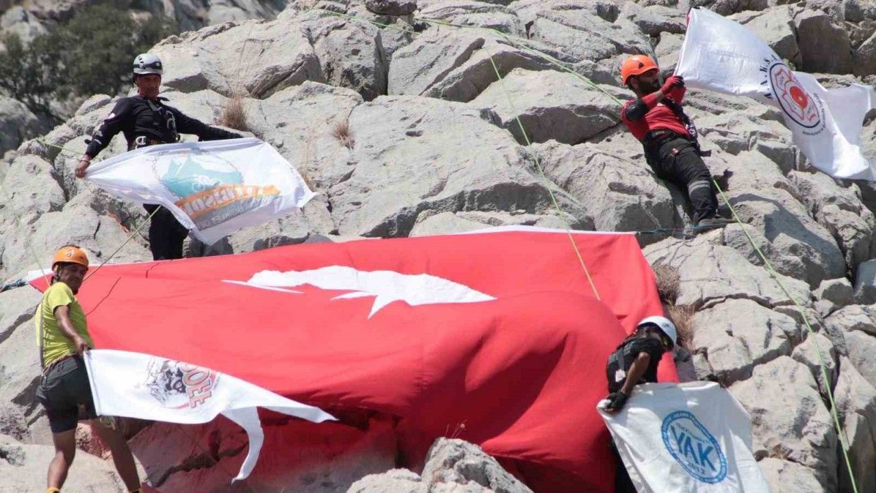 Antalya’da 30 Ağustos Zafer Bayramı’nın 103. yılı anısına Kızlar Sivrisi Dağı’na tırmanan dağcılar, zirvede dev Türk bayrağı açtı.