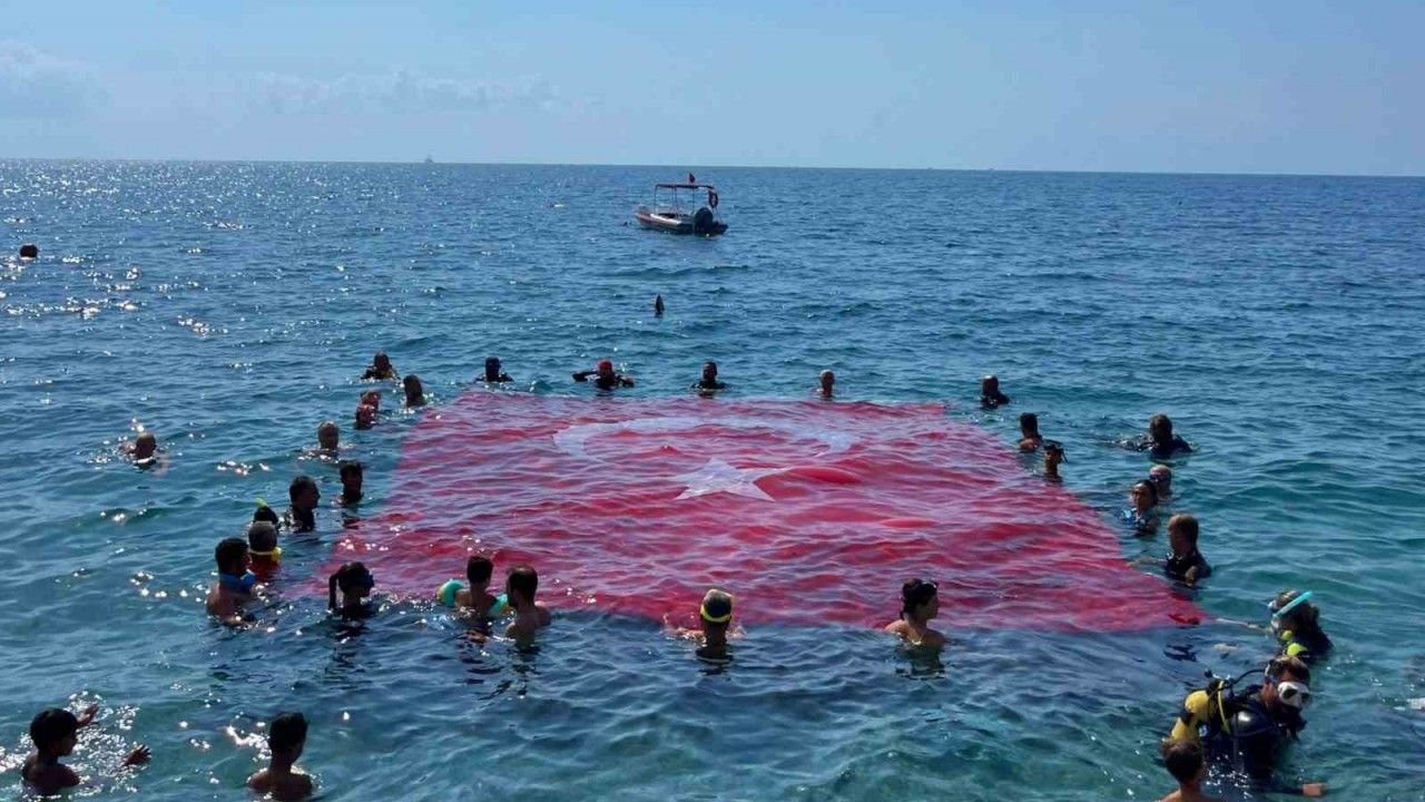 30 Ağustos Zafer Bayramı kutlamaları çerçevesinde yüzücü ve dalgıçlar tarafından denizde dev Türk Bayrağı açıldı.