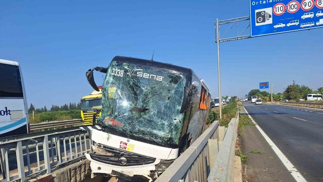 Antalya’nın Serik ilçesinde meydana gelen kazada, kontrolden çıkan tur otobüsü köprüden düşmek üzereyken durabildi. Otobüste bulunan 34 yolcu kazayı yara almadan atlattı.