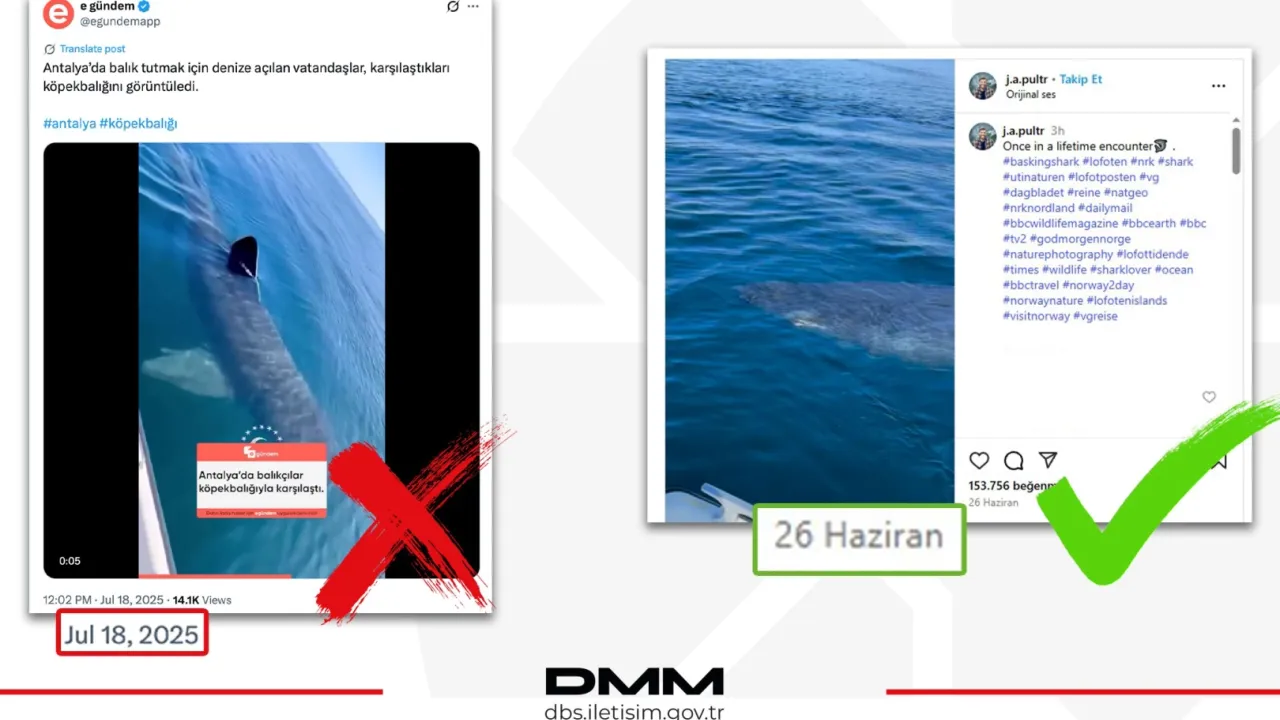 İletişim Başkanlığı, sosyal medyada “Antalya’da köpekbalığı görüldü” iddiasıyla paylaşılan videonun Norveç’te çekildiğini açıkladı. Dezenformasyonla Mücadele Merkezi'nden yapılan açıklamada, turizmi hedef alan dezenformasyona karşı suç duyurusu yapılacağı bildirildi.ANTALYA (İGFA) - İletişim Başkanlığı Dezenformasyonla Mücadele Merkezi (DMM), sosyal medyada Antalya sahillerinde köpekbalığı görüldüğü iddiasıyla paylaşılan bir videonun dezenformasyon olduğunu duyurdu.
