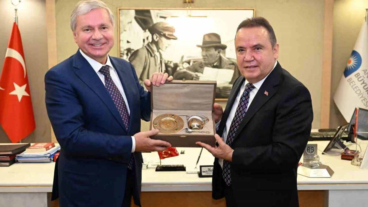 Antalya Büyükşehir Belediye Başkanı Muhittin Böcek, bir dizi temaslarda bulunmak üzere Antalya'ya gelen Moskova Hükümeti Bakanı, Dış Ekonomi ve Uluslararası İlişkiler Başkanı Sergey Çeremin, Moskova-Güney İdari Yönetimi Başkan Yardımcısı Aleksey Yeroşin ve beraberindeki heyeti kabul etti. Antalya'nın tarım ve turizm potansiyeli hakkında bilgi veren Başkan Böcek, heyeti Antalya'da ağırlamaktan memnuniyet duyduğunu söyledi.