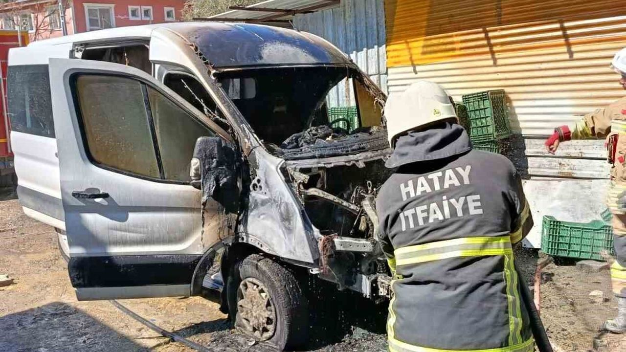 Hatay'da motor kısmı alevlere teslim olarak yanan minibüste hasar oluştu.