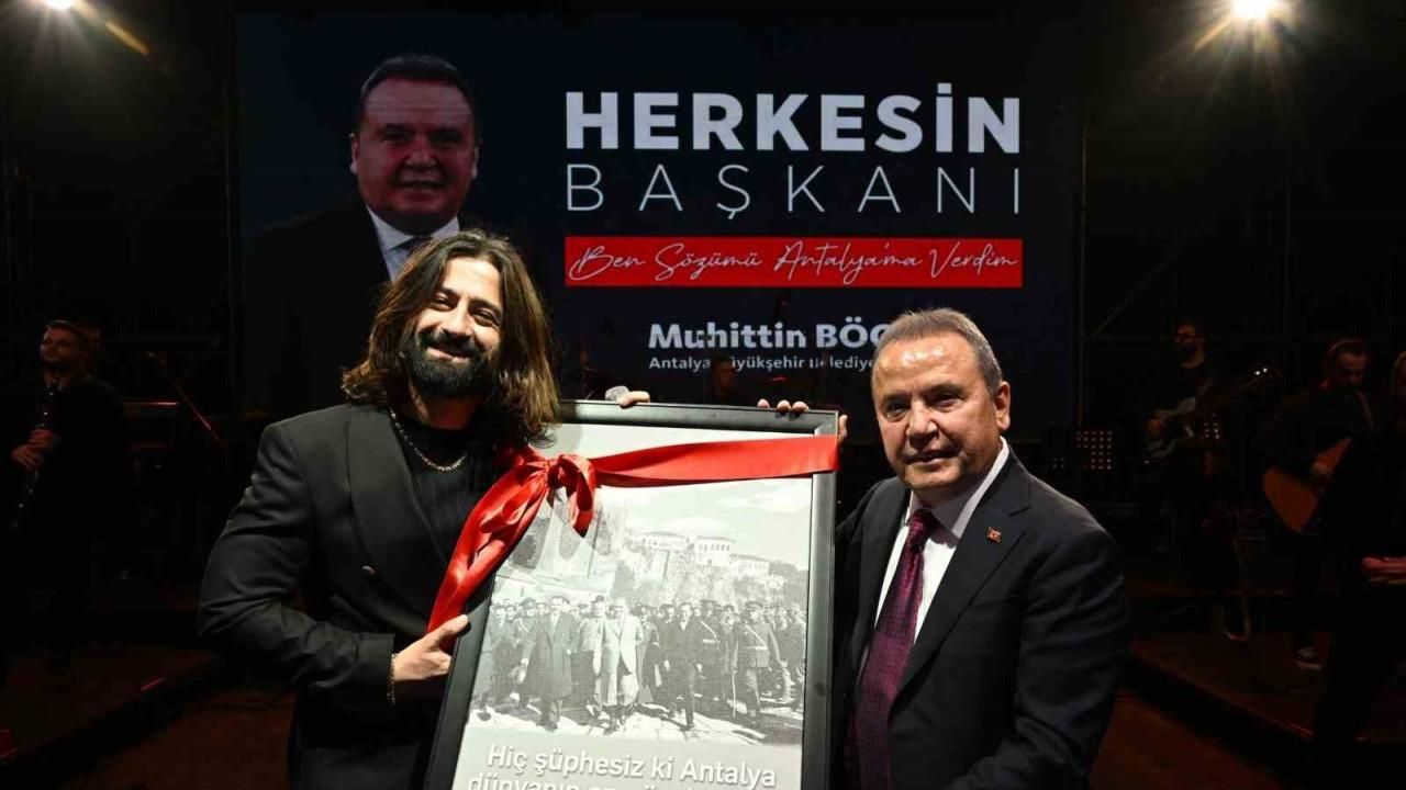 Başkan Böcek, ünlü sanatçı Koray Avcı’ya teşekkür ederek konser anısına Atatürk tablosu ve çiçek takdim etti.