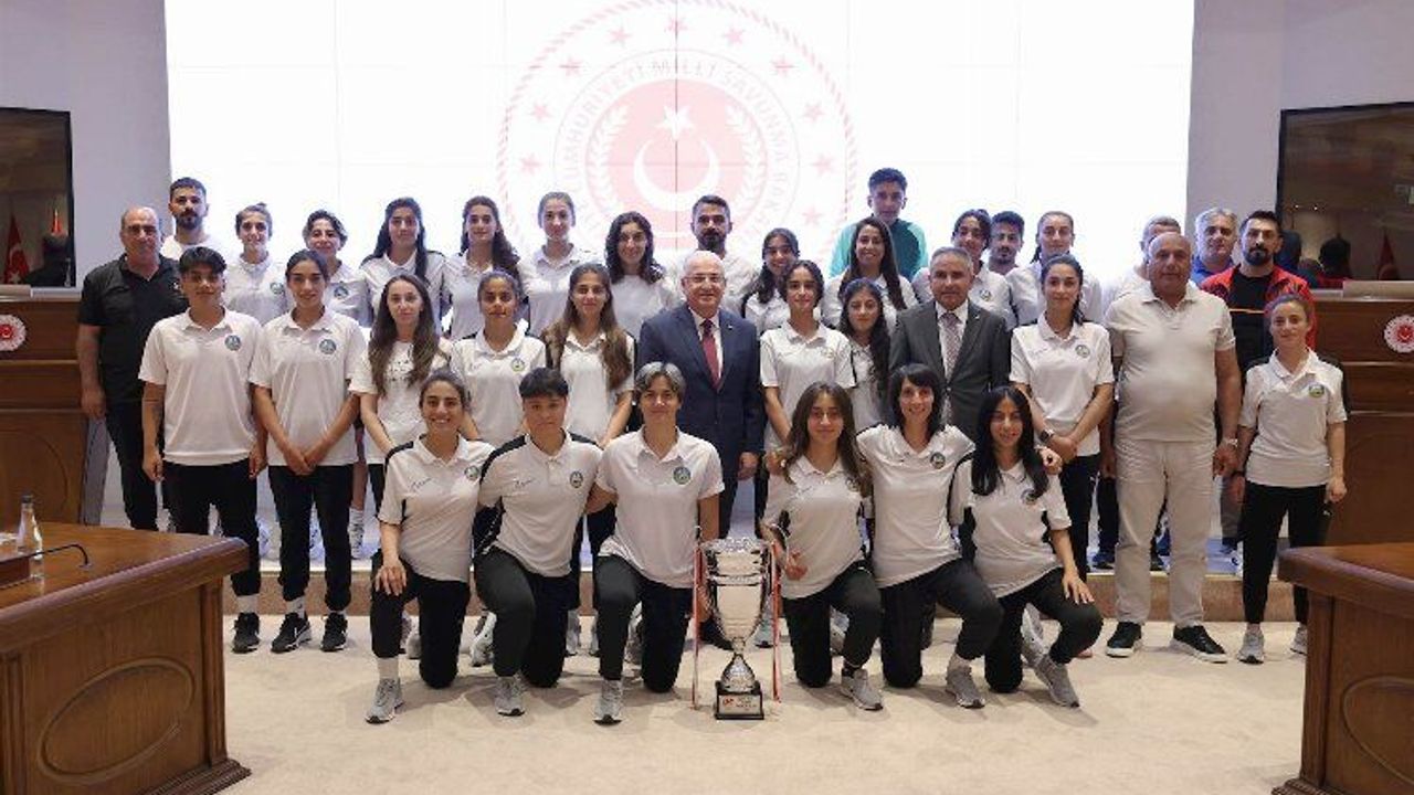 Millî Savunma Bakanı Yaşar Güler, Kadınlar 2’nci Ligi’nde Şampiyon olarak büyük bir başarı elde eden Yüksekova Belediyespor Kadın Futbol Takımı ile Millî Savunma Bakanlığında bir araya geldi. Şampiyonları alkışlayarak salona giren Bakan Yaşar Güler, şampiyonluk anlarına dair görüntüleri genç sporcularımızla birlikte izledi.HAKKARİ (İGFA) - Takımın Kaptanı Kübra Şen ise desteklerinden dolayı Bakan Yaşar Güler’e teşekkür ederek “Kupamız burada ve bu kupanın arkasındaki en büyük ve en güzel karakterlerden birisi sizsiniz. Bu emeğin en güzel paydaşlarından biri de sizsiniz. Şu zamana kadar yapmış olduğunuz maddi manevi bütün desteklerden dolayı bütün takım olarak size minnettarız. Hep birlikte bu başarıyı sırtlayıp daha güzel yerlere adım atacağız” dedi.