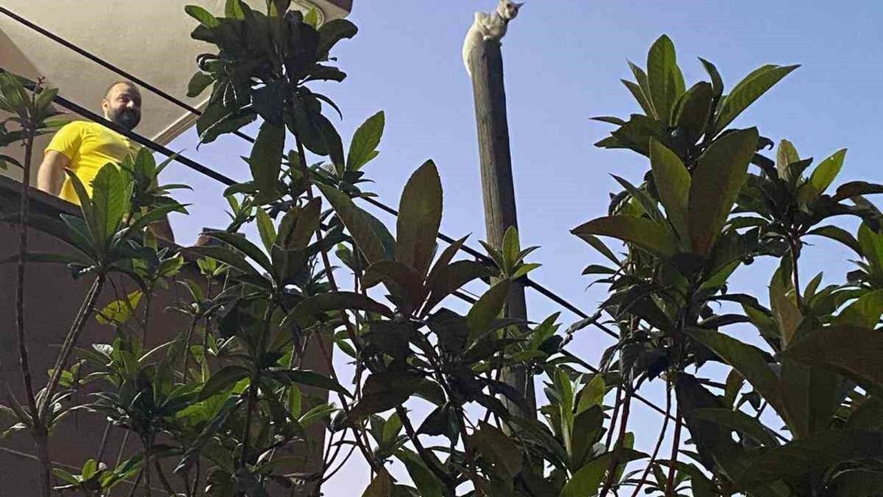 Hatay’ın İskenderun ilçesinde bir apartman dairesinin balkonundan ahşap elektrik direğine atlayarak mahsur kalan kediyi itfaiye ekipleri kurtardı.