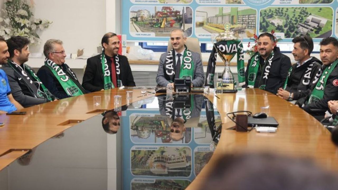 Mücadele ettiği Süper Amatör Lig’de şampiyon olarak Bölgesel Amatör Lig’e yükselme başarısı gösteren Çayırovaspor’un futbolcuları, teknik heyeti ve yönetimi şampiyonluk kupasıyla birlikte Çayırova Belediye Başkanı Bünyamin Çiftçi’yi ziyaret etti.KOCAELİ (İGFA) - Spor Kenti Çayırova’nın mimarı Çayırova Belediye Başkanı Bünyamin Çiftçi, şampiyon Çayırovaspor’u ağırladı. Bu sezon Süper Amatör Lig’de mücadele eden ve şampiyon olarak Bölgesel Amatör Lig’e yükselme başarısı gösteren Çayırovaspor, şampiyonluk kupasını Çayırova Belediye Başkanı Bünyamin Çiftçi’ye getirdi.