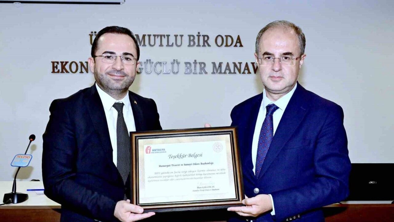 Konuşmanın ardından Antalya Vergi Dairesi Başkanı İlhan Karayılan ve Manavgat Vergi Dairesi Müdür Vekili Sultan Küçüktuna Manavgat’ın 52 ili geride bırakarak Antalya ilçeleri arasında vergi tahsilatında birinci olması sebebiyle Manavgat İş dünyası adına Başkan Güngör’e plaket takdim edildi. MATSO Başkanı Güngör ve Meclis Başkanı Sedat Öz tarafından Antalya Vergi Dairesi Başkanı İlhan Karayılan ve Manavgat Vergi Dairesi Müdür Vekili Sultan Küçüktuna’ya kente yaptıkları katkılar nedeniyle Manavgat İş dünyası adına plaket takdim etti.