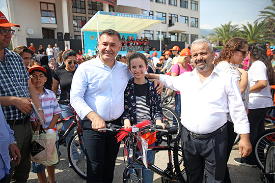 “Alanya Belediyesi olarak kent trafiğini rahatlatmak, çevre kirliliğini azaltmak ve doğa ile en uyumlu taşıt olan bisiklet kullanımını yaygınlaştırmak için sizlerin başarısını bisiklet hediyesi ile ödüllendirmek istedik” diyen Başkan Yücel, “Göreve geldiğim günden bu güne hem şehir içi, hem de tüm sahil bandında bisiklet yollarını yaygınlaştırmak amacıyla 30 kilometreden fazla bisiklet yolu yaparak hizmete açtık. Alanya’yı nasıl festivaller şehri yaptıysak, Alanya’yı nasıl sporun başkenti yaptıysak, Alanya’yı bisiklet şehri yapacağız. İnşallah sizler de hediyemiz olan bisikleti, bisiklet yollarımızda güvenle sağlıkla kullanırsınız” diye konuştu.