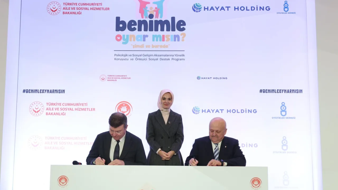 Konuşmaların ardından Engelli ve Yaşlı Hizmetleri Genel Müdürü Dr. Yasin Akar ve Hayat Holding Genel Sekreteri Osman Aksoy ‘Benimle Oynar Mısın?’ Psikolojik ve Sosyal Gelişim Aksamalarına Yönelik Koruyucu ve Önleyici Sosyal Destek Programı’nın protokolünü imzaladı.