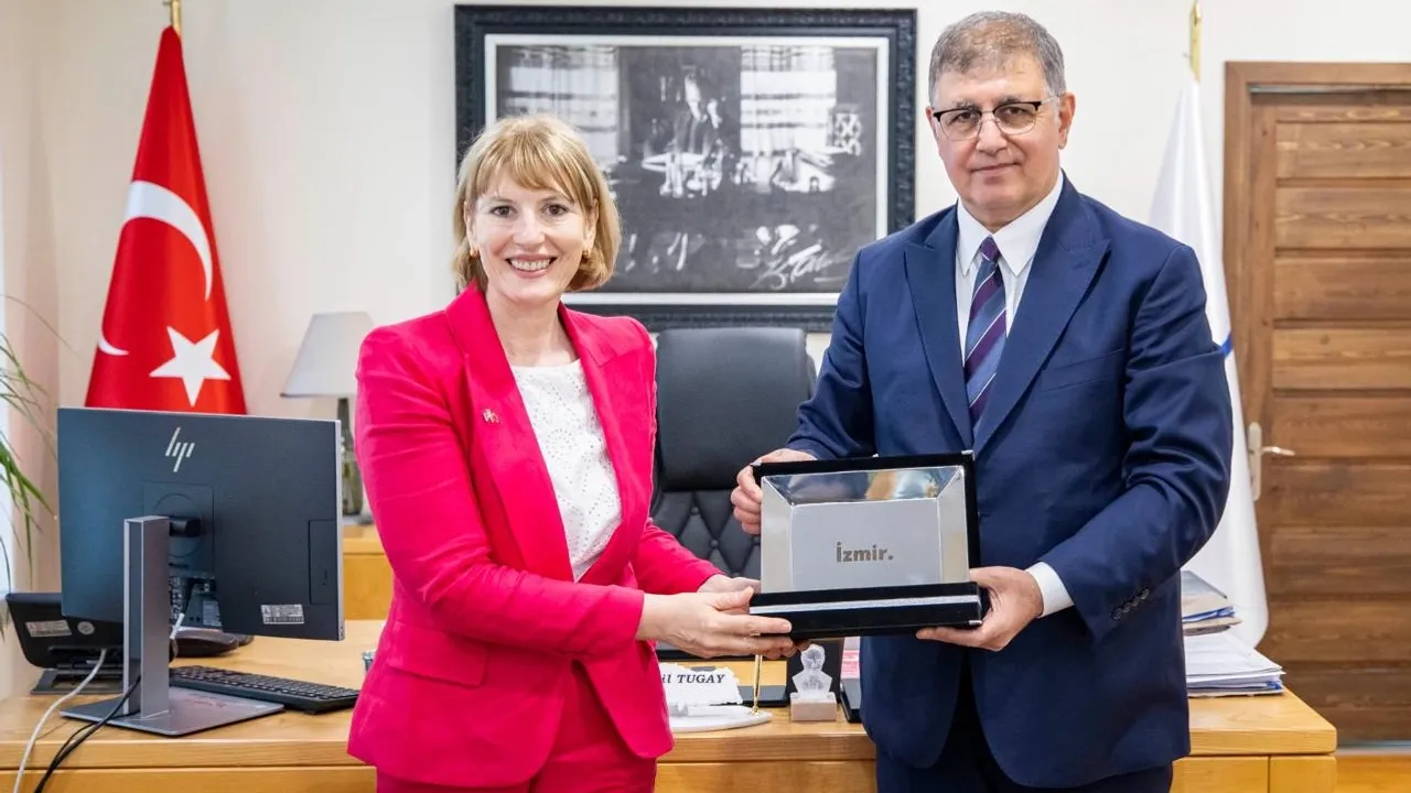 İzmir Büyükşehir Belediye Başkanı Dr. Cemil Tugay, Birleşik Krallık Türkiye Büyükelçisi Jill Morris ve beraberindeki heyeti ağırladı. Ziyarette kültürel etkinlikler, fuarlar, sağlık turizmi, yenilenebilir enerji konularında iş birliği fırsatları konuşuldu.İZMİR (İGFA) - Birleşik Krallık Ankara Büyükelçisi Jill Morris ve beraberindeki heyet, İzmir Büyükşehir Belediye Başkanı Dr. Cemil Tugay’ı makamında ziyaret etti. Ziyarette Jill Morris ile Konsolos Neale Jones, İngiltere’nin İzmir Konsolosluğu yetkilileri, İzmir Büyükşehir Belediyesi Genel Sekreter Yardımcısı ve ESHOT Genel Müdürü Övünç Özgen ile bürokratlar yer aldı.