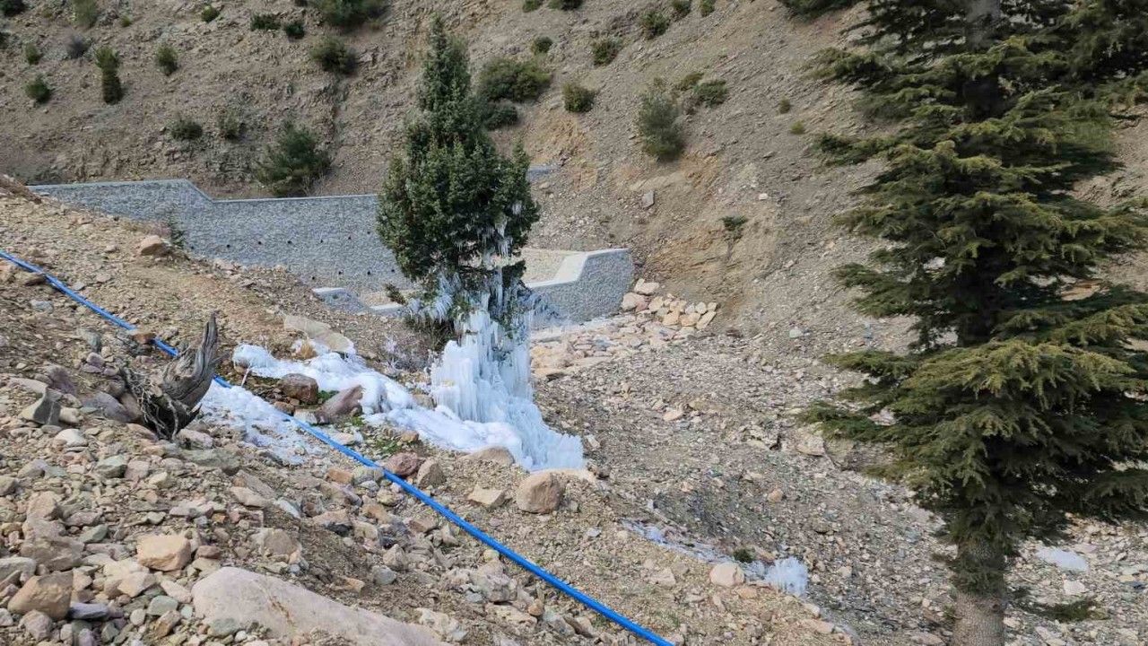Hatay’da kırılan borudan sızan su, soğuk havanın etkisiyle çam ağacının buzla kaplanmasına neden oldu.