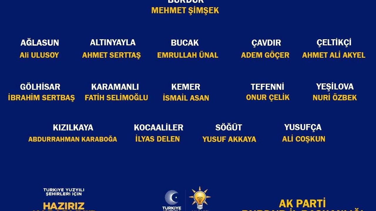 AK Parti Burdur İl Başkanlığı tarafından açıklanan listeye göre; Ağlasun mevcut Belediye Başkanı Ali Ulusoy, Altınyayla mevcut Belediye Başkanı Ahmet Serttaş, Bucak mevcut Belediye Başkanı Emrullah Ünal, Karamanlı mevcut Belediye Başkanı Fatih Selimoğlu, Gölhisar mevcut Belediye Başkanı İbrahim Sertbaş tekrar aday olarak gösterildi. Kemer ilçesi mevcut Belediye Başkanı Ömer Aktürk ise aday adayı olmadığı için ise yerine İsmail Asan aday olarak gösterildi.