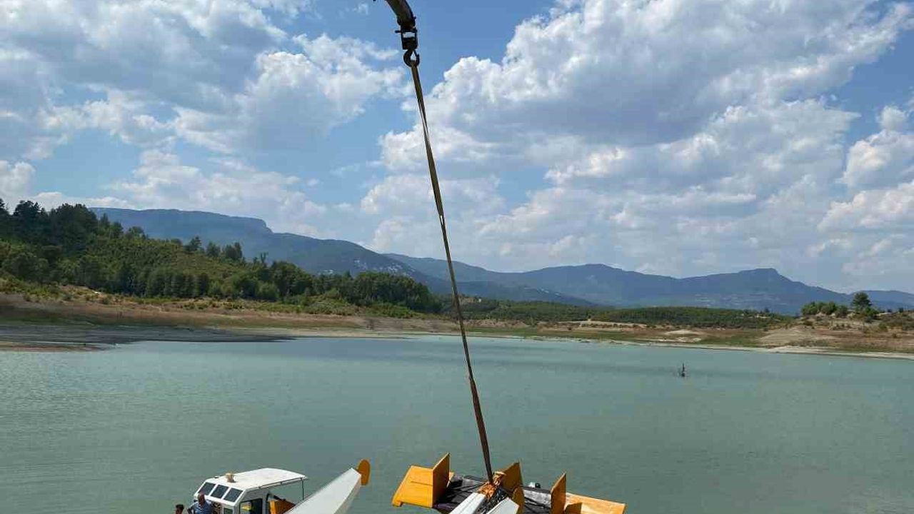 Burdur’da barajdan su almak için deneme uçuşu yaptığı sırada kaza kırıma uğrayıp ters dönen uçak vinç yardımıyla bulunduğu yerden çıkarıldı.