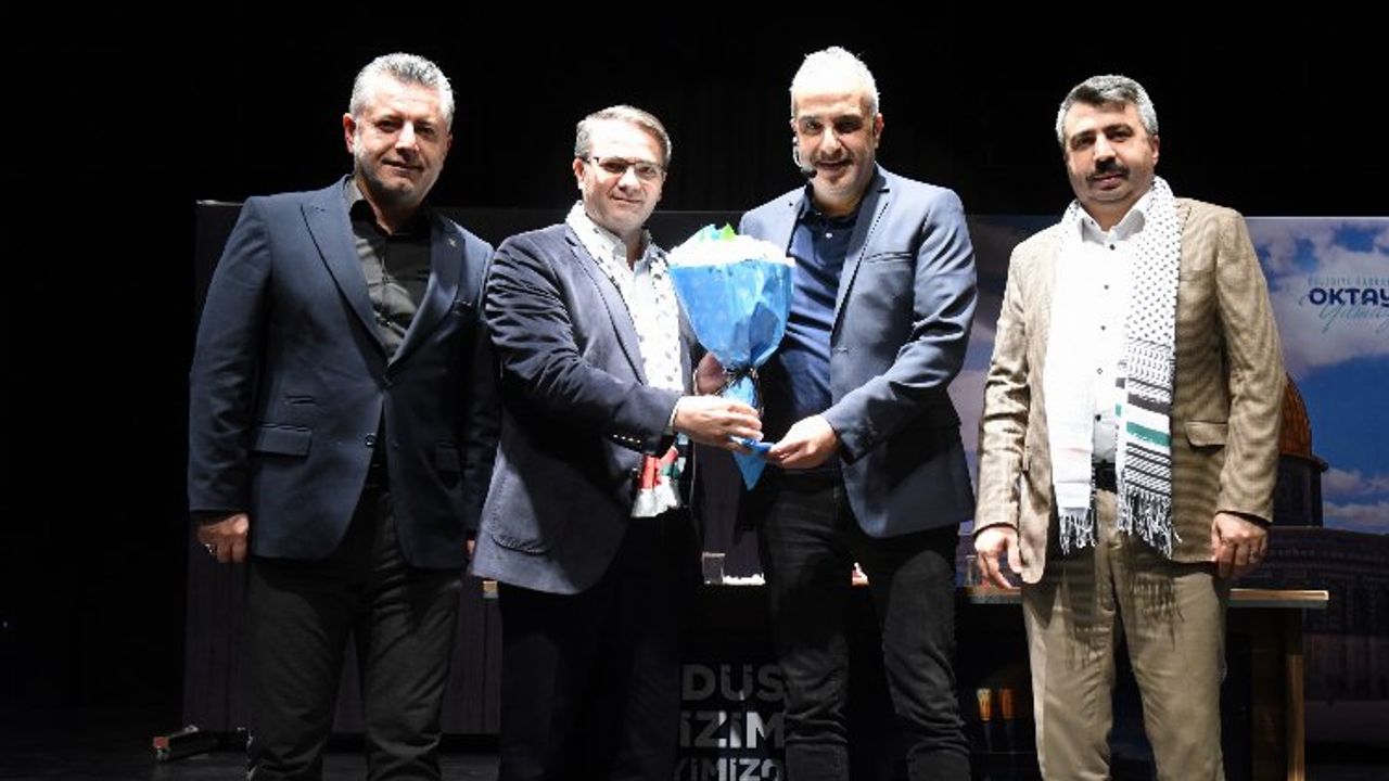 Söyleşinin ardından sahneye çıkan Yıldırım Belediye Başkanı Oktay Yılmaz, “Kudüs, insanlığın merkezi, bizim gönül coğrafyamızın incisidir. Müslümanların kutsal mabedidir. 75 yıldır İsrail zulmü karşısında sadece ve sadece yüreklerindeki imanın gücüyle mücadele eden, insanlığın ve Müslümanların haysiyetini koruma görevini üstlenen Filistinli kardeşlerime şükranlarımı sunuyorum. İnançlarını ve vatanlarını savunurken şehit düşen kardeşlerimize Rabbimden rahmet diliyor ve bu mücadelede yaralanan gazilerimize acil şifalar diliyorum. Terörle mücadele operasyonlarının devam ettiği bölgelerden ne yazık ki acı haberler aldık. Vatanımızın bölünmez bütünlüğü, milletimizin huzuru ve güvenliği için gözünü kırpmadan şehitlik mertebesine yürüyen tüm kahramanlarımızı rahmet ve minnetle anıyorum. Bekir Develi’ye bu samimi sohbeti ve anlattıkları için bir kez daha teşekkür ediyoruz. En kısa zamanda Özgür Aksa’da buluşmak duasıyla” diye konuştu.