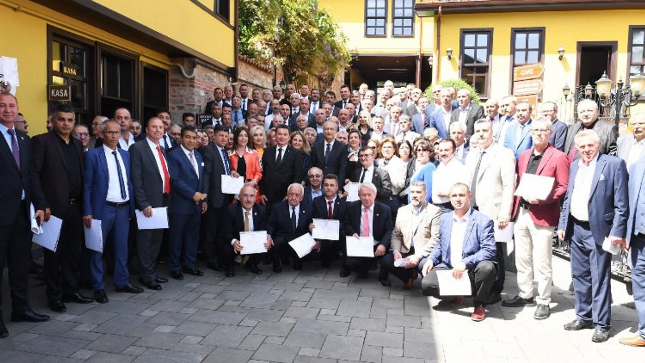 Osmangazi’nin 136 mahallesinde görev yapacak muhtarlar, Sümbüllü Bahçe Konağı’nda düzenlenen tören ile mazbatalarını Osmangazi Belediye Başkanı Erkan Aydın ve Osmangazi Kaymakamı Ali Partal’ın elinden aldı. Osmangazi’de beş yıl boyunca birlikte görev yapacağı muhtarlar ile tek tek tanışan Başkan Aydın, “Yeni dönemin tüm muhtarlarımız için hayırlı olmasını temenni ediyorum. Tüm muhtar arkadaşlarımı tebrik ediyor ve görevlerinde başarılar diliyorum” diye konuştu.