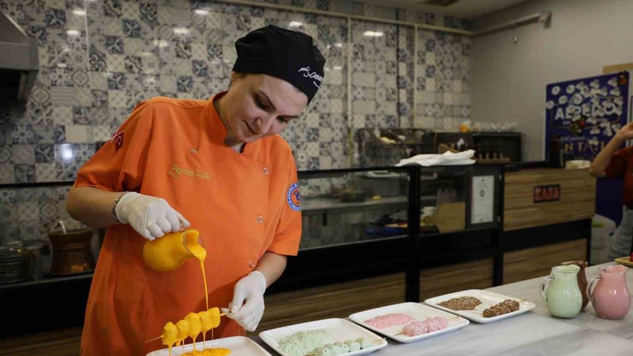 Adanalı tatlıcının geleneksel katmeri çeşitlendirmek için yaptığı Adana usulü ’çöp şiş katmer’ Ramazan’a özel rengarenk servis ediliyor.