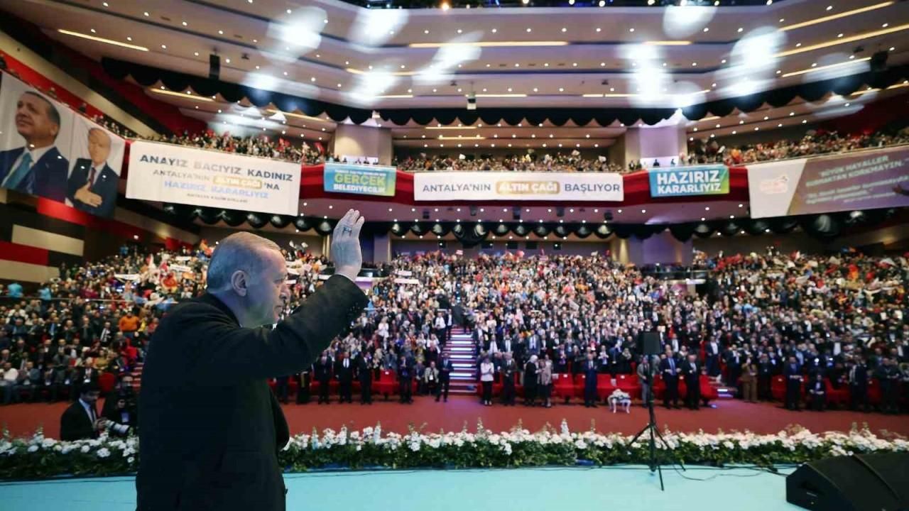 Cumhurbaşkanı Erdoğan yaptığı konuşmada, Akdeniz’in incisi Türkiye’nin turizm başkenti, tarımın, ticaretin, sanayinin, diplomasinin lokomotif şehri Antalya’da olmaktan memnuniyet duyduğunu belirterek, "Antalya’yı özlemişiz. İlçe adaylarımızın da belirlenmesiyle artık tam saha pres yapacak şekilde çalışacağımız döneme giriyoruz. Bundan 30 yıl önce mahalli idarelerde ilk ke göreve geldiğimizde önümüze çıkan zorluklara rağmen şehirlerimize hizmet için aşkla çalıştık. Bahane aramadık, kolaya kalanlardan asla olmadık. Belediyenin kaynaklarını en doğru ve etkin şekilde kullanarak vatandaşlarımızın sorunlarına çözüm ürettik. Bir önceki seçimle iş başına gelen CHP zihniyetinin ideolojik esareti altında boğulan tüm şehirlerimizi kısa sürede yaşanabilir hale getirdik. İstanbul, Ankara başta olmak üzere bizim hizmet ve eser siyasetimizle tanışan şehirlerimizi çeyrek asır boyunca adeta altın devirlerini yaşadılar” diye konuştu