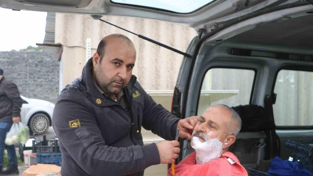 HATAY (İHA) –Hatay’da asrın felaketinde iş yeri yıkılan Hakan Mutlu, mesleğini seyyar berber olarak devam ettiriyor ve geçimini sağlıyor.