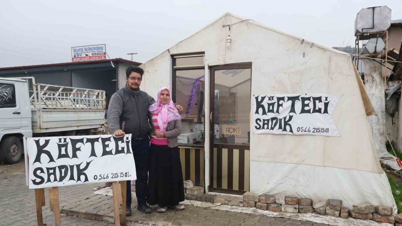 Hatay’da yaşayan 16 yıllık çift Sadık Kodalak ve Şükran Kodalak, ailesiyle birlikte depremde kaldıkları çadırı iş yerine dönüştürüp köftecilik yaparak hayata tutunuyor.