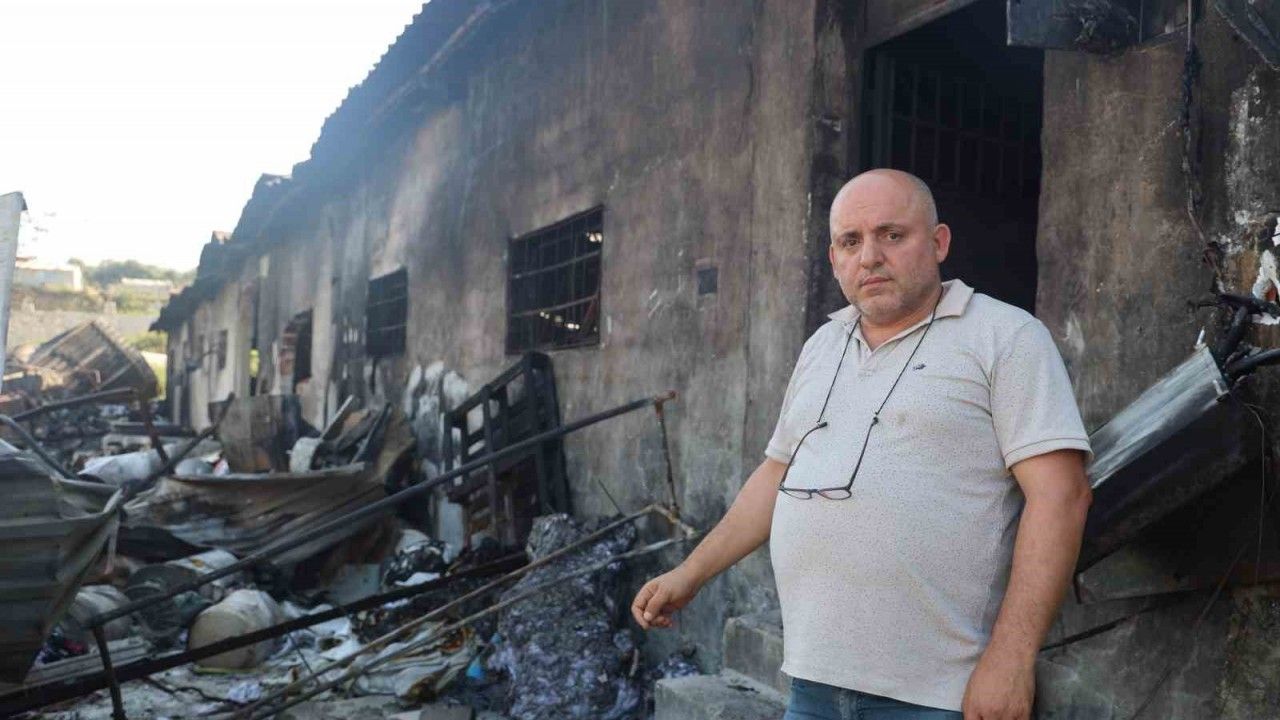 Hatay’da alevlerin yükseldiği yangında depremzede esnaf Atilla Çiçekli’ye ait tekstil deposundaki ürünler ve makineler yanarak kullanılmaz hale geldi. Depremde yıkılan iş yerlerinden kurtardığı tekstil ürünlerini ve makinelerini yangında kaybeden Çiçekli, 10 Milyon TL’lik kaybı olduğunu söyledi.