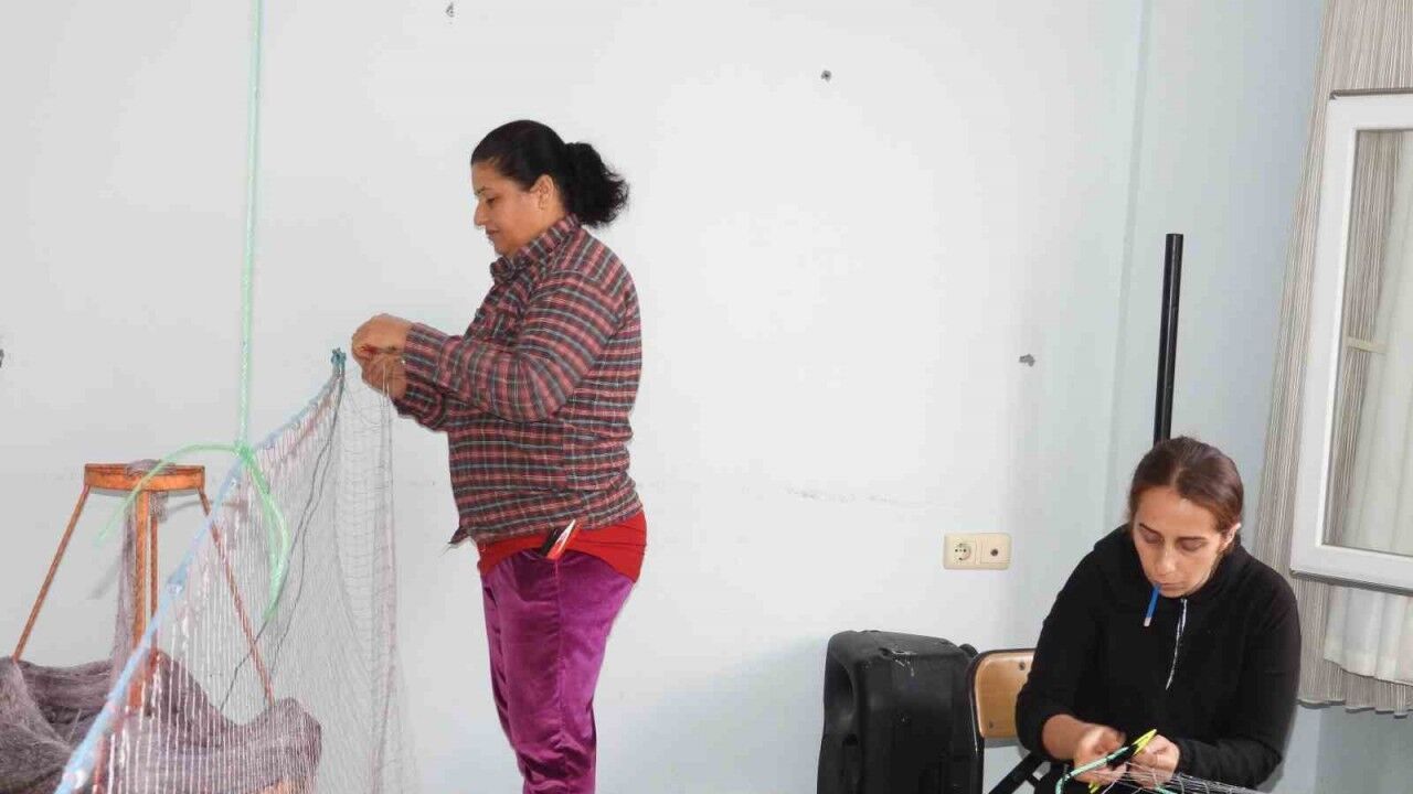 Depremlerde evlerini kaybeden Seher Aşker ve Çiğdem Okur, Tekebaşı Mahallesinde balıkçı ağları örerek hem depremi unutmaya çalışıyorlar hem de aile ekonomisine katkı sağlıyor.