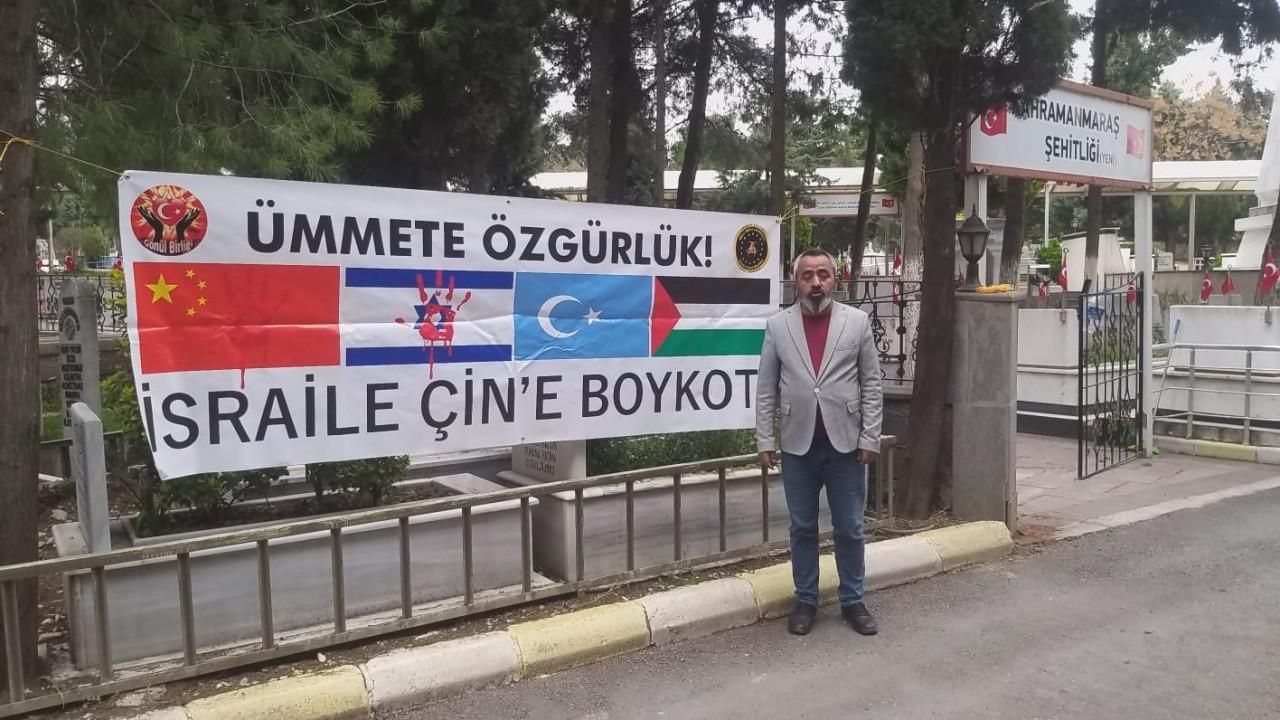 Kahramanmaraş’ta bir vatandaş İsrail ve Çin mallarının boykot edilmesini dirilerden değil ölülerden istedi. Dirilerin kendisin dinlemediğini ifade eden vatandaş mezarlıktaki şehitlikte pankart açtı.