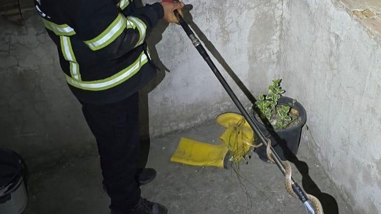 Hatay’da eve giren yılan itfaiye ekipleri tarafından yakalanarak doğaya bırakıldı.