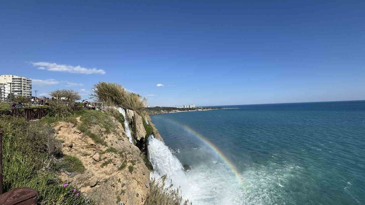 Lara bölgesinde bulunan Düden Şelalesi, her yıl olduğu gibi bu sene de yerli ve yabancı turistlerin yoğun ilgisini görüyor. Doğal güzellikleri ve eşsiz manzarasıyla ziyaretçilerini kendine çeken şelalede gökkuşağı oluştu. Düden Şelalesi'nin denizle buluştuğu noktaya gelen turistler, bu doğa harikasını ölümsüzleştirmek için birbirleriyle yarıştı. Gökkuşağı, ziyaretçilere unutulmaz anlar yaşattı.