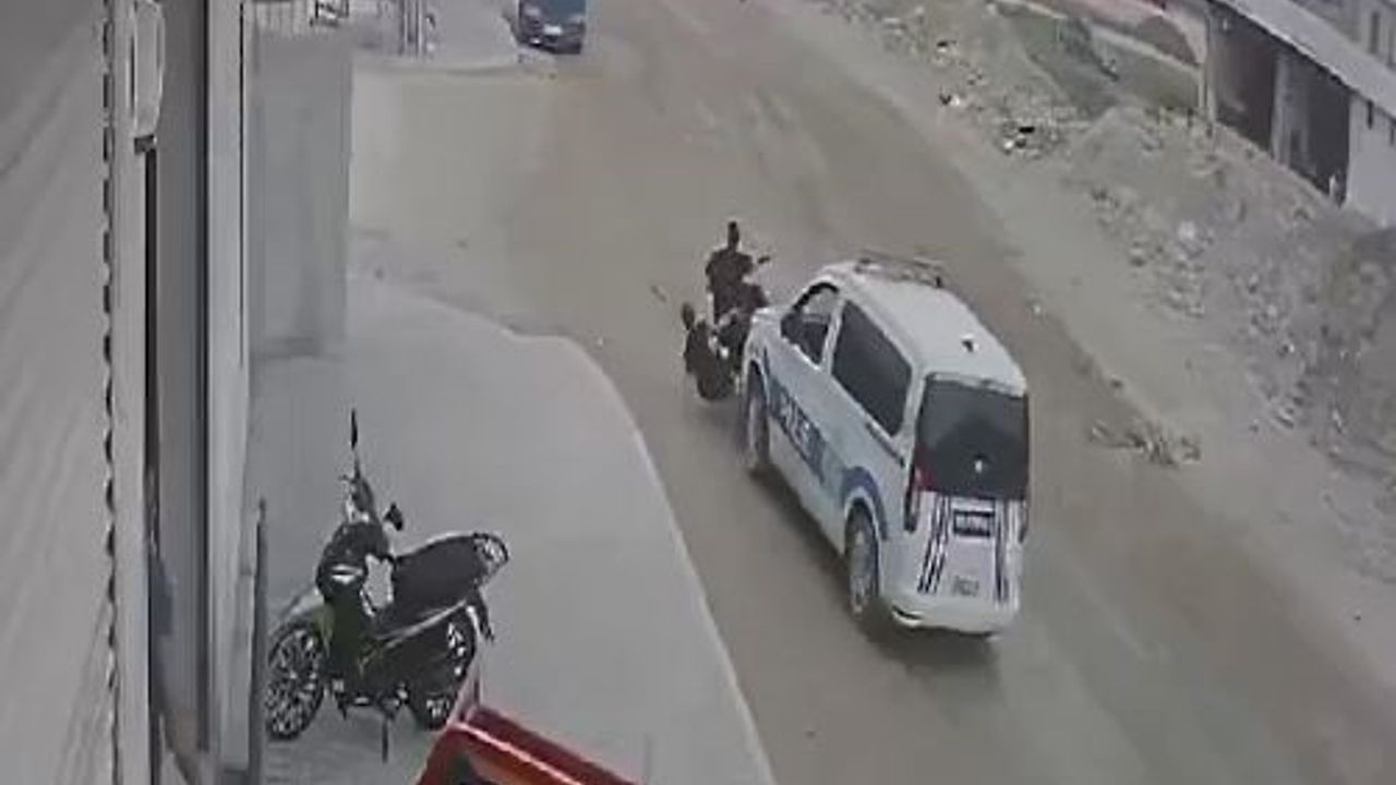 Adana’da polisin ’dur’ ihtarına uymayarak kaçan motosikletteki şahıslar, polisin motora çarpmasıyla durduruldu.