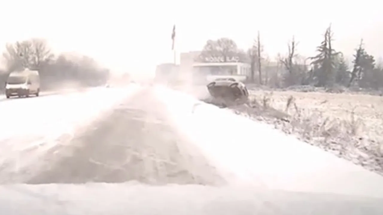 Düzce'de kar yağışı etkisini sürdürürken yeni açılan Çevre Yolu'nda sürücüsünün direksiyon hakimiyetini kaybettiği hafif ticari araç tarlaya devrildi. Kaza anı kameraya yansıdı.Sefer Demir / DÜZCE (İGFA) -  Düzce'de yapılan uyarılarla birlikte etkisini gösteren kar yağışı il genelinde etkili oldu.