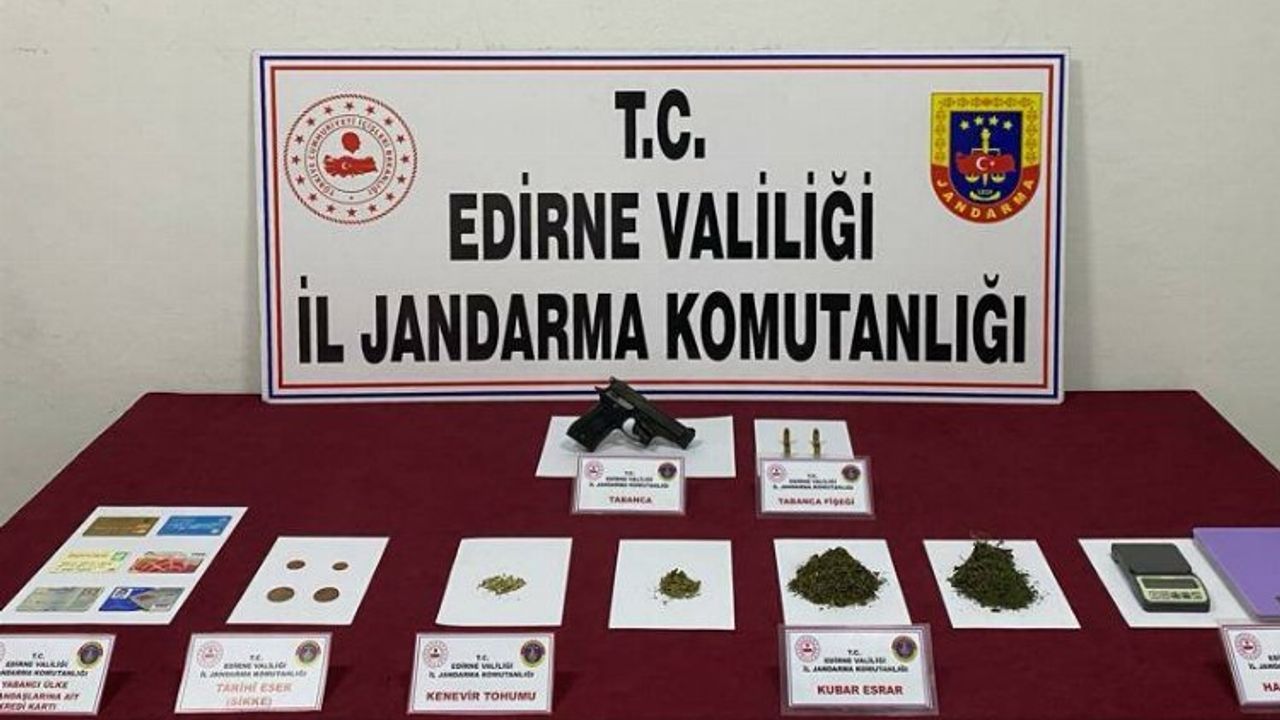 Edirne'de ruhsatsız tabanca, uyuşturucu ve dolandırıcılık malzemeleri yakalandı.Erdoğan DEMİR / EDİRNE (İGFA) - Edirne İl Jandarma Komutanlığınca, sorumluluk bölgesi içerisinde kaçakçılık olaylarının önlenmesine yönelik çalışmalar aralıksız sürerken, merkez ilçede bir şahsın evinde yapılan aramada, ruhsatsız tabanca, uyuşturucu madde, dolandırıcılık malzemeleri ele geçirildi.