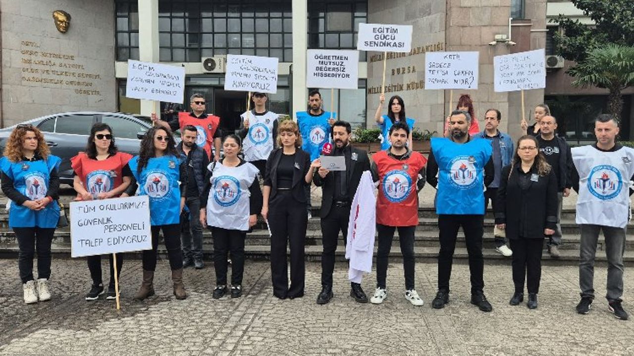 Eğitim çalışanlarına yapılan şiddete 'dur' demek için Eğitim Gücü-Sen Bursa İl Temsilciliği tarafından düzenlenen basın açıklamasında, hiçbirinin bu tür bir tehlike ile yüz yüze kalmayı hak etmediklerini söyledi.BURSA (İGFA) - Eğitim Gücü-Sen Bursa İl Temsilciliği, İstanbul'da Irak asıllı bir öğrenci tarafından öldürülen okul müdürü İbrahim Oktugan adına ve eğitim çalışanlarına yapılan şiddete dur demek için Bursa İl Müdürlüğü önünde basın açıklaması gerçekleşti.