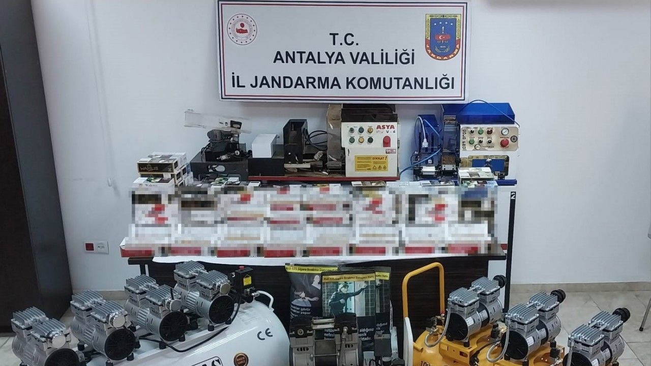 Antalya İl Jandarma Komutanlığı Asayiş Şube Müdürlüğü, Jandarma Suç Araştırma Timi (JASAT), Kaçakçılık ve Organize Suçlarla Mücadele (KOM) Şube Müdürlüğü ve Döşemealtı İlçe Jandarma Komutanlığınca, kaçakçılıkla mücadele kapsamında yapılan çalışmalarda S.A. ve H.E. isimli şahısların ikamet ettikleri evlerde kaçak sigara üreterek satışını yaptıkları bilgisi alındı. Antalya Cumhuriyet Başsavcılığı talimatıyla şüphelilerin ikamet adreslerinde yapılan aramalarda, 3 sigara sarma makinesi, 92 bin 200 makaron, 40 kilo tütün ve bin 500 sigara paketleme malzemesi ele geçirildi.