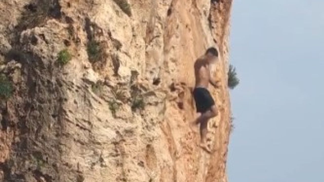 Antalya’da falezlerin üzerindeki sivri kayalıklarda tehlikeli bir şekilde ilerleyen genç, yaklaşık 15 metre yükseklikten denize atladı. Gencin o anları ve atlayışı cep telefonu kamerasına saniye saniye yansıdı.